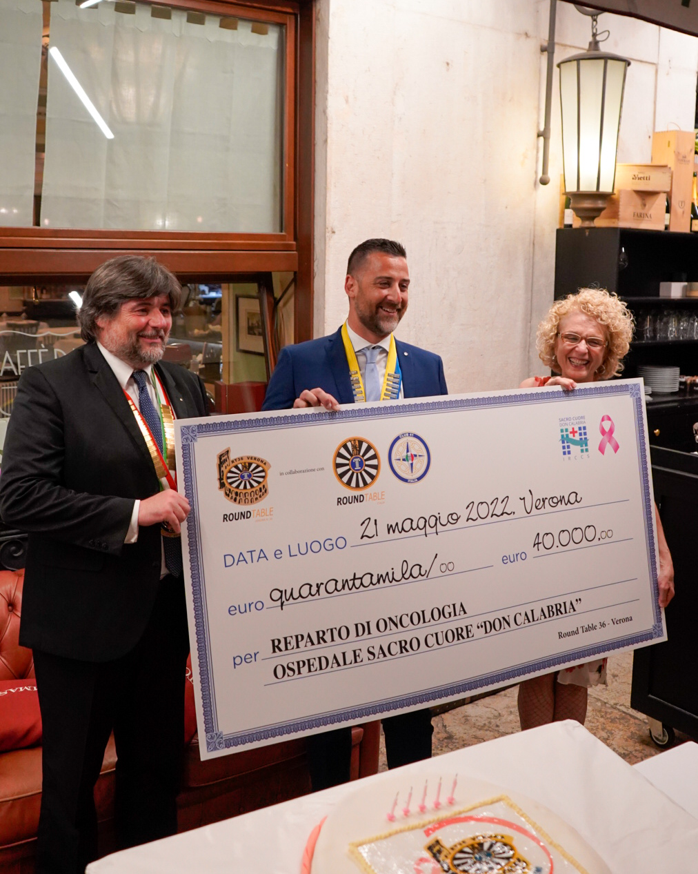 Evento conviviale concomitante con la consegna dell’assegno da 40.000€ per il reparto di Oncologia dell’Ospedale del Sacro Cuore di Negrar. La somma ricavata dal service è stata impiegata nell’acquisto di materiale per il centro trasfusionale e per aggiornamenti software del reparto.